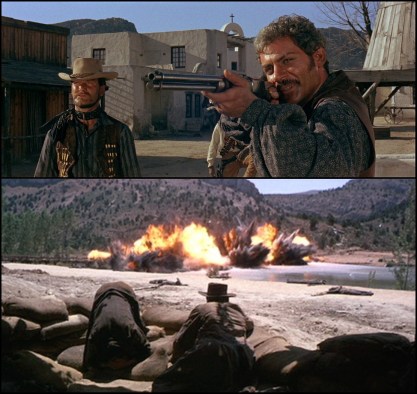 Top: Gian Maria Volonte (right) stars as the principal villains of A Fistful of Dollars and For a Few Dollars More. Bottom: Eli Wallach (left) and Eastwood (right) take cover as they blow up a bridge separating Union and Confederate troops in GBU.