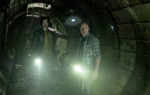 James McCavoy (right), Bill Hader (left) and the rest of the “Losers Gang” descend into Pennywise’s (Bill Skarsgard, off-screen) subterranean layer one final time in It 2’s endgame.