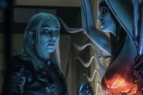 Noomi Rapace (left) stars as the film’s principal villain, a sort of “dark elf terrorist.”