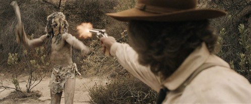 Kurt Russell fires his six-shooter at a charging cannibal in Bone Tomahawk.