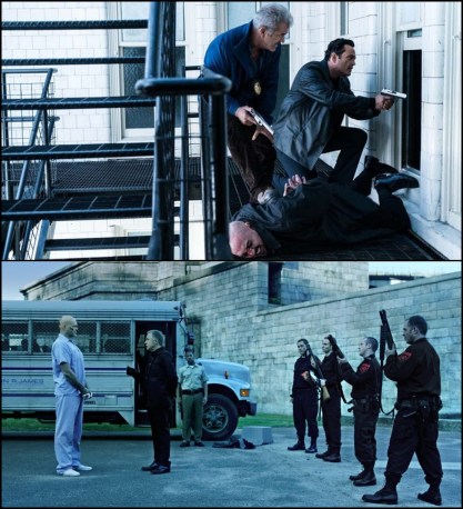 Top: Mel Gibson (top left) and Vince Vaughn (top right) restrain a gangster (Noel Gugliemi, bottom center) as they conduct a drug bust in Dragged Across Concrete. Bottom: Vaughn (far left) stares down Don Johnson (second from left) as he is inducted into Redleaf Correctional Facility in Brawl in Cell Block 99.