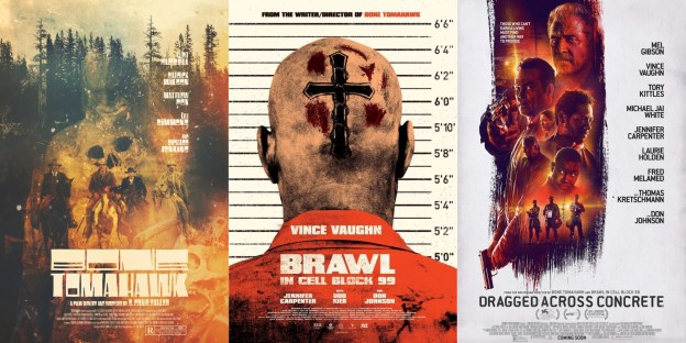 To better establish the subject-matter of these films, Bone Tomahawk is about a group of 19th century cowboys who attempt to rescue townsfolk kidnapped by cannibalistic savages in the American frontier; Brawl in Cell Block 99, starring Vince Vaughn in his greatest role, follows an imprisoned drug mule and former boxer (Vaughn) who must survive (re: brawl with) various prison gangs while their associates threaten to torture his pregnant wife; Dragged Across Concrete is a sort of neo-noir crime drama about crooked cops (Vaughn and Mel Gibson), vicious bank robbers (Thomas Kretchsmann et al.), and a couple small-time punks (Tory Kittles and Michael Jai White) who compete for a monumental heist of gold bullion. Have you detected a consistent style, yet?