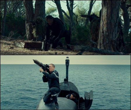 Top: French special forces prepare for an amphibious exfiltration from their mission-site in coastal Syria. Bottom: Reda Kateb (left) aims his Panzerfaust 3 at a hostile Iranian helicopter in the movie’s action-packed opening.