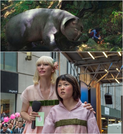 Top: The titular “super pig,” Okja (left), accompanies Ahn Seo-hyun (right) through the Korean woodlands. Bottom: Ahn Seo-hyun (right) is guided by her corporate chaperone/kidnapper, Tilda Swinton (left) to the former’s highly choreographed reunion with Okja.