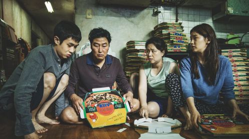 From left to right, Choi Woo-shik, Song Kang-ho, Jang Hye-jin, and Park So-dam make pizza boxes as part of a comical side-job for much needed income in Parasite’s opening act.