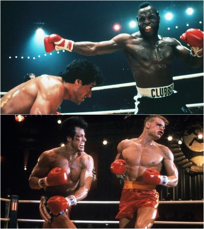 Ironically, the boxing sequences improve as the films get worse (Rocky III, top, and Rocky IV, bottom), using more slow-motion and handheld camerawork, but never quite shedding the series’ repetitive montage edits or comical sound FX.