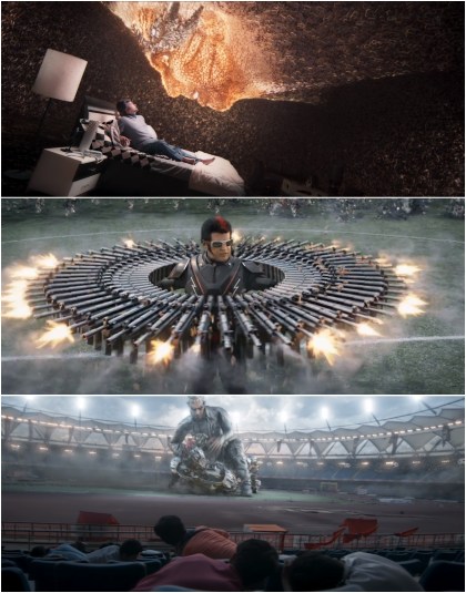 Top: One of the film’s better uses of digital FX during an interior, low-key lighting sequence, in which Akshay Kumar (top) confronts Rajinikanth (bottom). Middle & Bottom: Rajinikanth’s “Chitti 2.0” blasts away Kumar’s various incarnations in the film’s nutty finale.