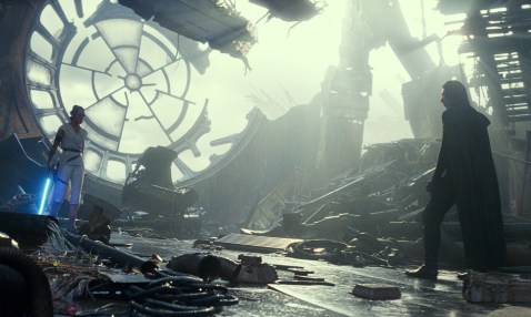 Daisy Ridley (left) stares down Adam Driver (right) in the ruins of the second Death Star.