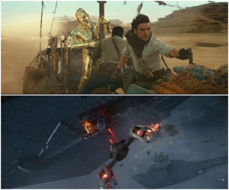 Top: Likable but underutilized castmembers Oscar Isaac (right), John Boyega (center), and Anthony Daniels (left) speed through another desert planet in The Rise of Skywalker’s opening act. Bottom: A Resistance Y-wing Starfighter engages First Order TIE Fighters in the film’s underwhelming finale.