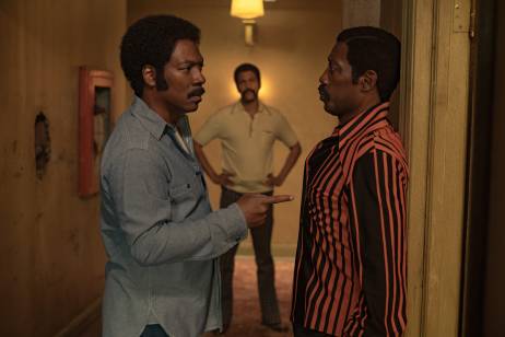 Rudy Ray Moore (Murphy, left) puts first-time director, D’Urville Martin (Wesley Snipes, right), in his place during the production of Dolemite as screenwriter and co-star, Jerry Jones (Keegan-Michael Key, center) observes.