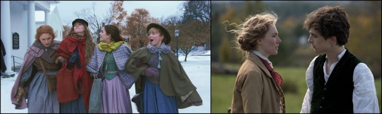 Left: From left to right, Eliza Scanlen, Saoirse Ronan, Emma Watson, and Florence Pugh star as the principal four sisters of Little Women. Right: Following the wedding of Watson, Timothée Chalamet (right) confronts Ronan about his romantic feelings for her.