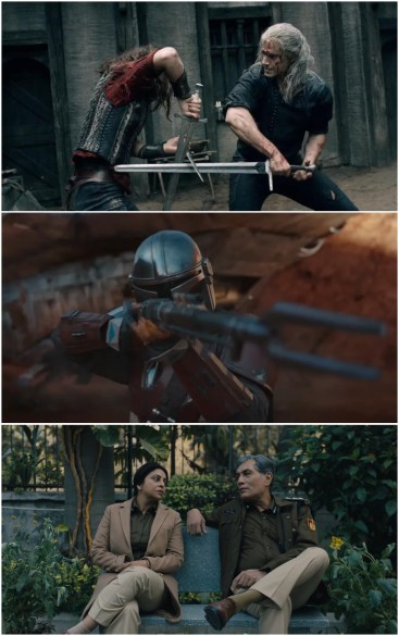 Top: Henry Cavill crosses swords with Emma Appleton in The Witcher. Middle: Pedro Pascal takes aim in The Mandalorian. Bottom: Shefali Shah discusses police matters with Denzil Smith in Delhi Crime.