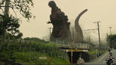 The final life stage of this latest Godzilla stomps the outskirts of Tokyo in a shot that recalls the original Gojira (1954).