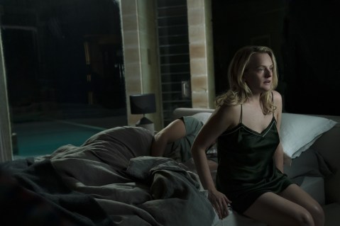 Elisabeth Moss (right) sneaks from her boyfriend’s (Oliver Jackson-Cohen, left) mansion in the film’s bravado opening sequence.