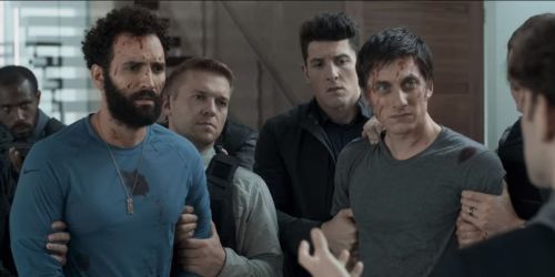 Marwan Kenzari (second from left) and Luca Marinelli (third from right) compete with villain Harry Melling (far right) to see whom can give the blandest supporting performance of The Old Guard.