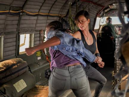 Charlize Theron grapples with Kiki Layne in one of the film’s better, but quite brief, action sequences.