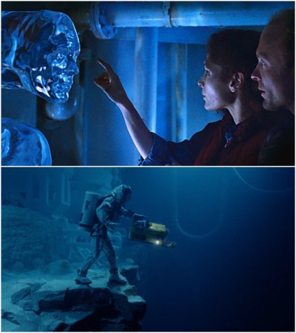 Top: Mary Elizabeth Mastrantonio (second from right) and Ed Harris (far right) witness a CGI miracle in Abyss‘ second act. Bottom: Harris tiptoes to the edge of the Cayman Trough with a remote submersible in hand.