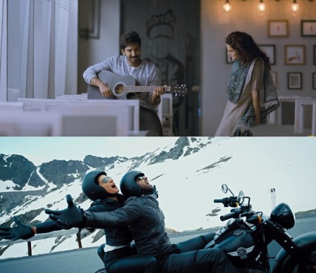 Top: Neevevaro eschews traditional screenwriting formula in favor of a seductive, clever mystery that unfolds naturally to the viewer and protagonist Aadhi Pinisetty (left). Bottom: Though Saaho’s action set-pieces range from grounded and visceral to FX-heavy and over-the-top, its musical numbers are lazy, featuring little more than generic helicopter footage across scenic vistas or actors prancing in front of obvious green-screens.