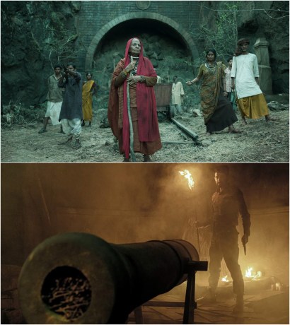 Top: Villagers block the entrance to the titular Betaal tomb, which corporate overlords are keen to “develop.” Bottom: Lead Vineet Kumar Singh prepares for one of the miniseries’ better moments in which he annihilates a group of zombies with 19th century firepower. That’s what you call a “hard Brexit!“
