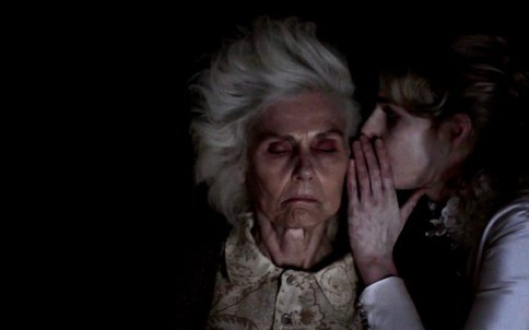 In one of the film’s multiple surrealist sequences, Paula Prentiss (left) listens to the words of Lucy Boynton (right), who haunts the former’s estate.