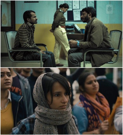 Top: Rajesh Tailang (right) interrogates a rape and murder suspect while the series lead, Shefali Shah (center, background) paces. Bottom: Shah’s daughter, Yashaswini Dayama (center) attends one of several protests dramatized in Delhi Crime.