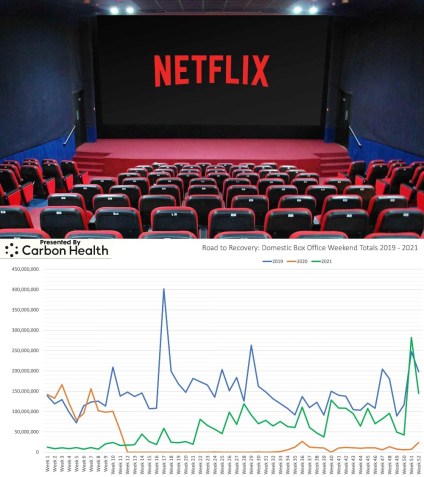 Top: Is the future of theatrical films determined by the likes of Netflix? Bottom: With the exception of Week #51 (the debut of Spider Man: No Way Home [2021], the highest grossing film of the year), the 2021 box office operated similarly to the pre-pandemic 2019 box office, just from a much lower baseline.