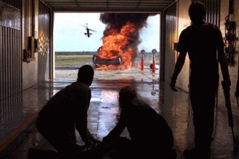 From left to right: Timothy Olyphant, Radha Mitchell, and Joe Anderson look in shock after an AH-1G HueyCobra destroys their ride after surviving an attack by infected in the film’s signature carwash sequence.