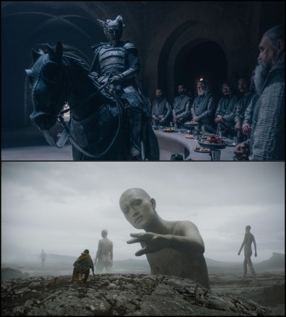 Top: Ralph Ineson (far left) stars as the titular Green Knight underneath layers of impressive prosthetics. Bottom: Patel observes several female giants striding across a valley, some of the film’s few noticeable digital FX.