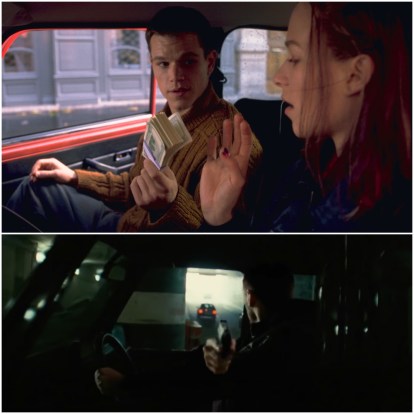 Top: Unlike later Bourne films, Identity builds its narrative core around audience-surrogate and female lead Franka Potente (right), who’s introduced to Damon’s Bourne much as we are. Bottom: In Supremacy’s bonkers car chase-finale, Federal Security Service agent Karl Urban prepares for the worst T-bone accident on film.