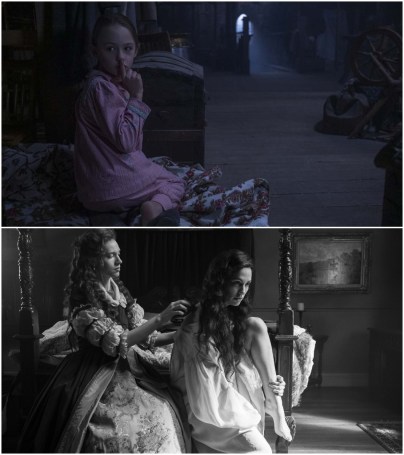 Top: Amelia Bea Smith shushes a noisy ghost while playing hide-and-seek in The Haunting of Bly Manor. Bottom: In a flashback episode depicting Bly Manor’s past, Kate Siegel (right) suffers from an illness that results in her spirit haunting the grounds for centuries to come.