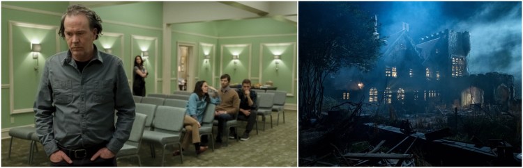 Left: Timothy Hutton (far left), patriarch of the Crain family, observes his deceased child in The Haunting of Hill House’s standout episode. Right: Witness the beautiful imagery of the titular dilapidated mansion.