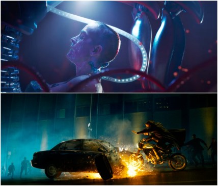 Top: Carrie-Anne Moss is rebuilt, both physiologically and digitally, as a new software power source for this latest iteration of the Matrix. Bottom: In the lone cool set-piece of the entire movie, Reeves and Moss cruise through a nightmarish cityscape filled with endless waves of “bots (this Matrix’s replacement for Agents).”