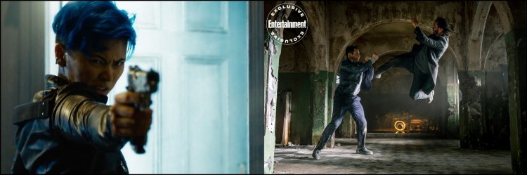 Left: Jessica Henwick stars as the most memorable of a rather forgettable supporting cast in The Matrix Resurrections. I love her haircut, though. Right: Keanu Reeves still (kind of) knows kung fu for his unnecessary fistfight against Jonathan Groff’s inexplicable reboot of Hugo Weaving’s Agent Smith.