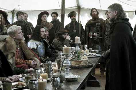 Jean de Carrouges (Damon, far right) protests his demotion from his family’s historical captaincy in favor of Jacque Le Gris (Driver, second from left, foreground) by Count Pierre d’Alencon (Affleck, far left).
