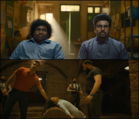 Top: I find this image a representative summary of Doctor — an unfunny comedian (Yogi Babu, left) and a lead actor with bizarre, inexplicable hair and makeup (Sivakarthikeyan) making weird faces. Bottom: Vinay Rai (center left) threatens to execute Zaara Vineet (center) later in the film.