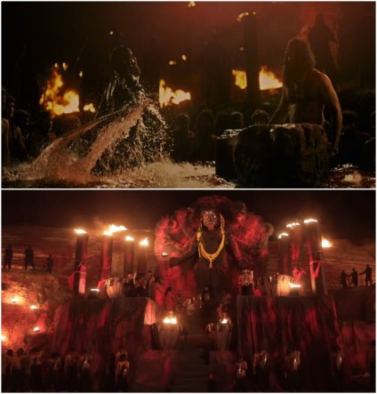 Yash (top left) leaps from the water to assassinate Ramachandran Raju as the latter is coronated under a statue of Kali (bottom).