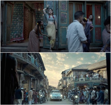 This unconventional screenplay maintains unpredictability despite the story’s overall formulaic biopic content, divides the story into three distinct acts, and modulates narrative pace. What makes GK stand out not just from other biopics but from most contemporary historical dramas, however, is Bhansali’s attention to visual detail across both mise-en-scène as well as camerawork. The blocking, set, costume, and hair-and-makeup design in all Bhansali films I’ve seen are great, but GK’s physical backdrop is memorable in subtler ways than the filmmaker’s most over-the-top productions like Hum Dil De Chuke Sanam, Devdas, or Padmaavat (2018). GK limits its number of locations to a couple outdoor street sets and several indoor brothel rooms, balconies, and corridors, emphasizing quality in its mid-20th century period details over quantity of scenery. Furthermore, GK’s effective combination of physical sets and digital composite backgrounds is superior to most big-budget throwback Indian dramas perhaps as a function of that production discipline.