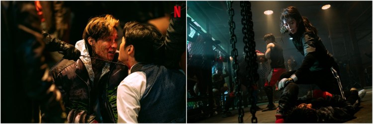 Left: Chang Ryul (center) stares down Lee Hak-joo (center right) as the former turns on his gangster brethren. Right: Han So-hee trains for combat in the series premiere.