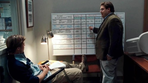 All this is a roundabout introduction to our discussion of Bennett Miller’s Moneyball, a mid-budgeted (~$50 million) dramatization of the 2003 nonfiction book of the same name by Michael Lewis, which chronicles the Oakland Athletics‘ (A’s) watershed 2002 season that saw the first major adoption of sabermetrics (i.e. baseball statistics) into player scouting, team building, and player performance analysis at the professional level. The film’s overarching theme is the importance of empiricism and intellectual strategy in running an organization, how main characters Billy Beane (Brad Pitt at his most subtle) and Peter Brand (Jonah Hill, a fictionalized amalgamation of Paul DePodesta and his various assistants) successfully transform the organizational mindset of a massive business community by questioning decades of entrenched tradition. See the Hollywood parallels yet?