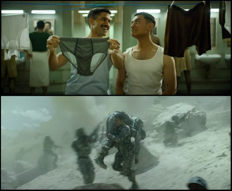 Khan enjoys his time in the armed forces with guest star and Telugu phenom Naga Chaitanya (top; he’s passionate about men’s undergarments instead of shrimp) until their brush with combat (bottom) changes their fates forever.