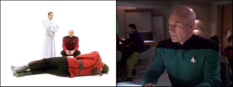 Left: Q has present day Captain Picard examine the life choices that led to the latter’s now presumed demise. Right: I would rather die as the man I was than live the life I just saw.