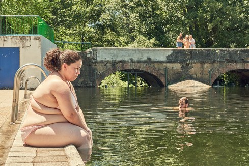 Laura Galán (left foreground) suffers mocking insults from her peers (background) while an even worse abuser (Richard Holmes, midground) observes.