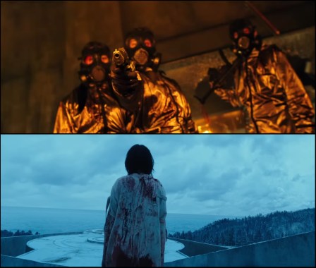 After Part I’s conclusion leaves a Jeju Island laboratory complex in ruins, mop-up crews euthanize as many wounded superhumans as possible (top), but miss Shin Si-ah’s protagonist (bottom) in Part II.