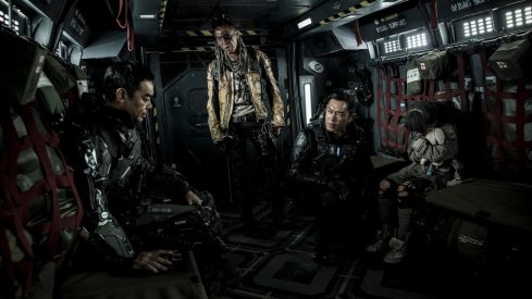 Those are all the positives, however. WoF’s ostensible premise, a futuristic dystopia ravaged by climate change and threatened by an unrelated meteorite impact that transported an aggressive extraterrestrial plant to earth, is in truth an elaborate excuse to showcase lead actors Koo and Lau in mechanical exoskeletons punching, shooting, or jumping around various robotic or alien antagonists in forgettable set-pieces that lack physical weight. Moments of certain action scenes are fun, like an elongated freeway chase between an armored transport and a large mech, but too many sequences are polluted by comical platforming acrobatics, excessive CGI debris FX, chaotic handheld camerawork, and laughable slow-motion combat that rips off either 300 (2007), The Matrix (1999), Hard-Boiled (1992), or some combination thereof. Will blockbusters stop with the fucking slow-motion already?