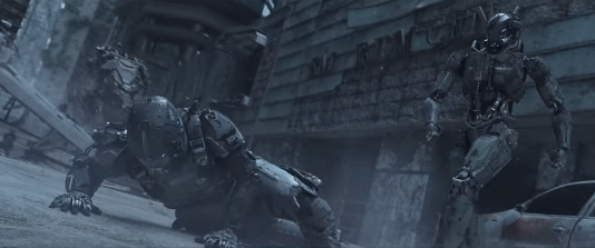 Louis Koo (left, replaced by a CGI double) battles a droid from Neill Blomkamp’s Elysium (2013) while a mech from Ghost in the Shell (1995) advances in the background.
