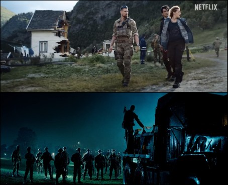 Top: Ine Marie Wilmann (far right) leads an uninspired cast across a scene of the eponymous troll’s destruction. Bottom: Costar Mads Sjøgård Pettersen (far right) directs troops constructing a surprise “troll-killer” weapon.