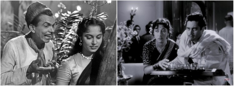 Left: Johnny Walker (not the whiskey, Johnnie Walker) bonds with female lead Waheeda Rehman in a comedy sequence that shockingly is endearing instead of irritating. Right: Director-star Guru Dutt (right) works a brief stint as a servant for the husband of his former girlfriend, Mala Sinha (left) in Pyaasa’s first act.