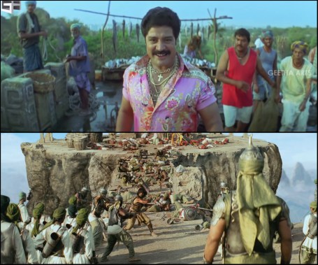 Top: Srihari (foreground center), who died four years after Magadheera’s release at only 49 years of age, provides effective comic relief throughout the story. Bottom: In the 17th century flashbacks, star Ram Charan battles dozens of armed assailants in a neat composition of physical sets and blue-screen backgrounds.