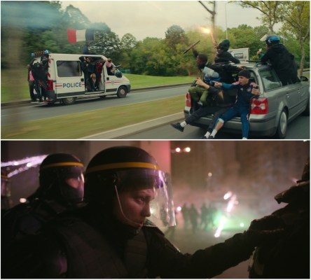 Top: Local protestors led by Sami Slimane escape with a police van and a locker full of confiscated weaponry after raiding a local precinct in Athena’s opening scene. Bottom: Supporting actor Anthony Bajon stars as our point-of-view character amidst the riot police.
