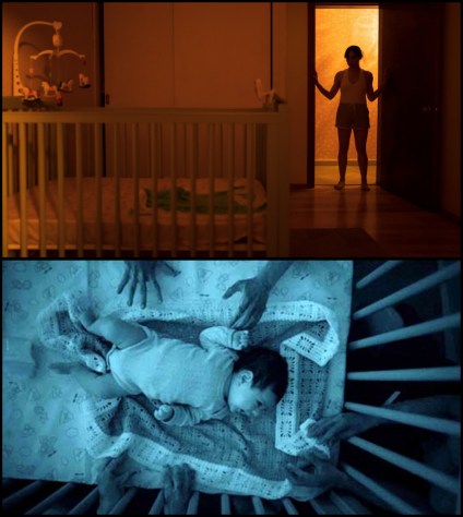Multiple hauntings surround Solián’s former workshop, now converted into a nursery (top), the most unsettling of which is the handling of her 2-month old newborn by a demon (bottom). Unfortunately, the film pulls several punches here and its demonic mythology makes little diegetic sense.